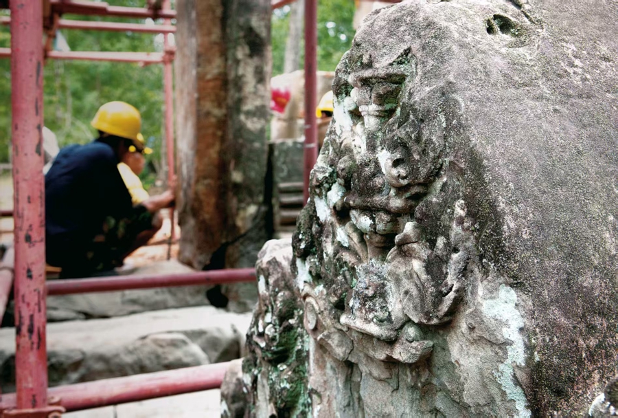 在位于柬埔寨吴哥的茶胶寺,工人在修复工地上工作。(新华社发)
