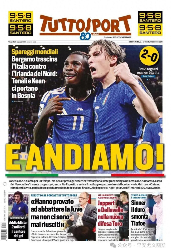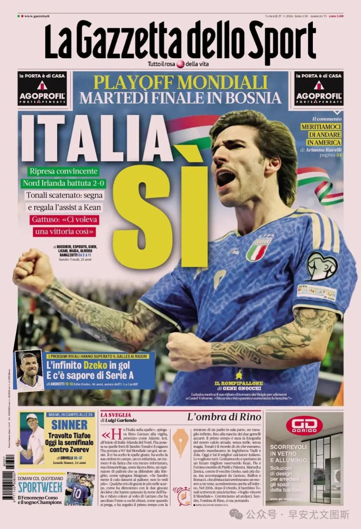 意大利,是的。世界杯附加赛:周二在波黑的决赛。令人信服的下半场,以2比0击败了对手北爱尔兰。托纳利释放:进球并将助攻基恩。加图索:“我们想要这样的胜利。”宝刀未老的哲科进球,像意甲的味道,下一个对手通过点球大战击败了威尔士。