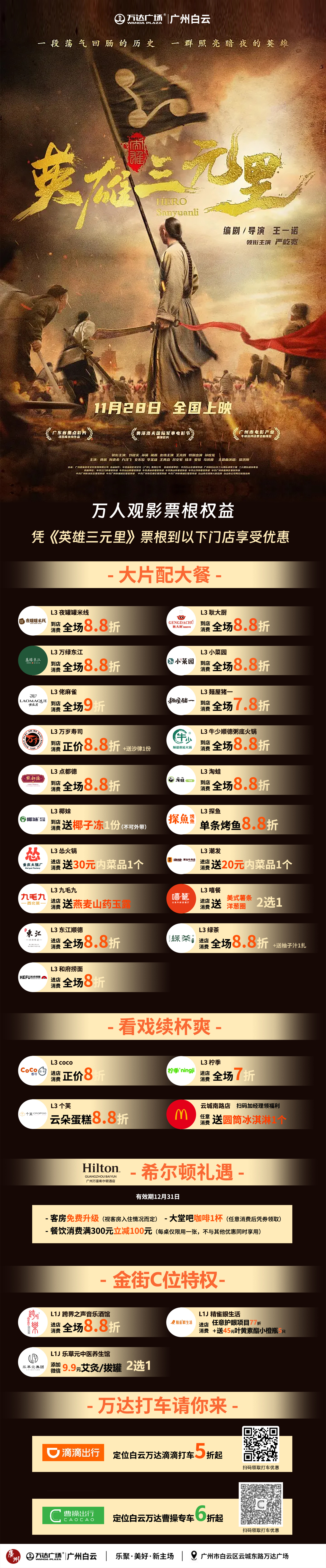 活动提示:各项优惠有效期不尽相同,部分福利数量有限,先到先得,具体使用规则请以各商户现场告知为准。带上您的《英雄三元里》电影票根,快来白云新城商圈,解锁专属您的吃喝玩乐购精彩体验吧!